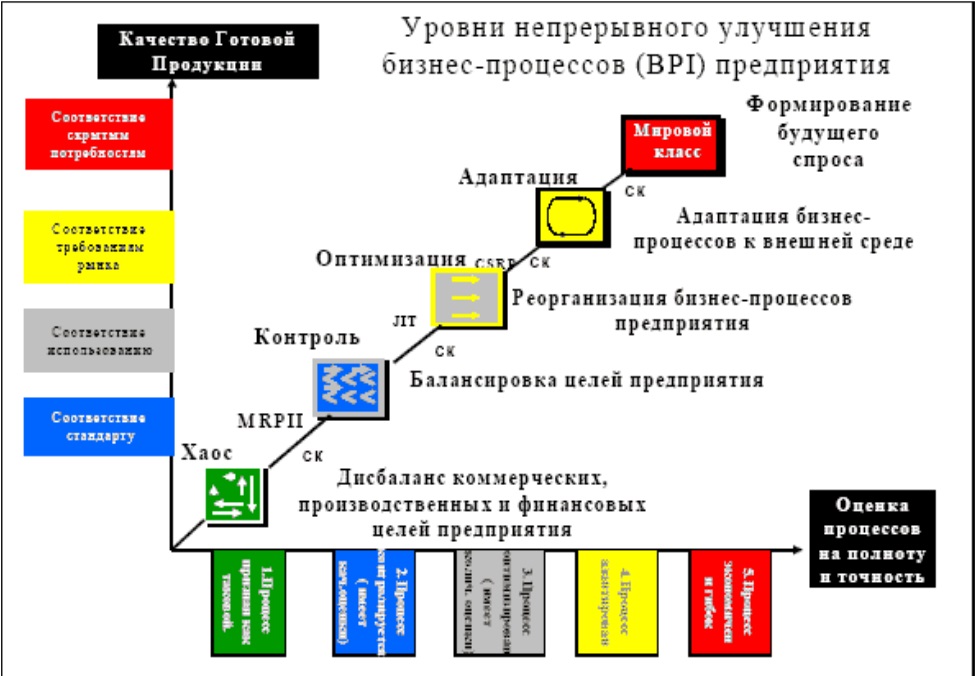 В основу перехода предприятия с одного уровня BPI на следующей положено предварительное моделирование бизнес-процессов предприятия и внедрение новой бизнес-модели в практику.