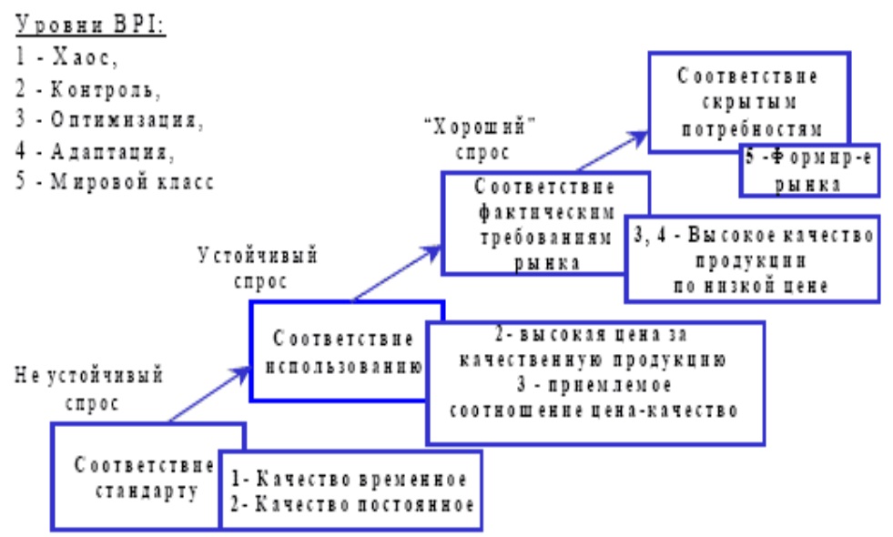 «Соответствие фактическим требованиям рынка» подразумевает высокое качество продукции по низкой цене. Продукция данного уровня качества может конкурировать с продукцией мировых производителей. С данным уровнем соотносятся такие BPI уровни как «Оптимизация» и «Адаптация»