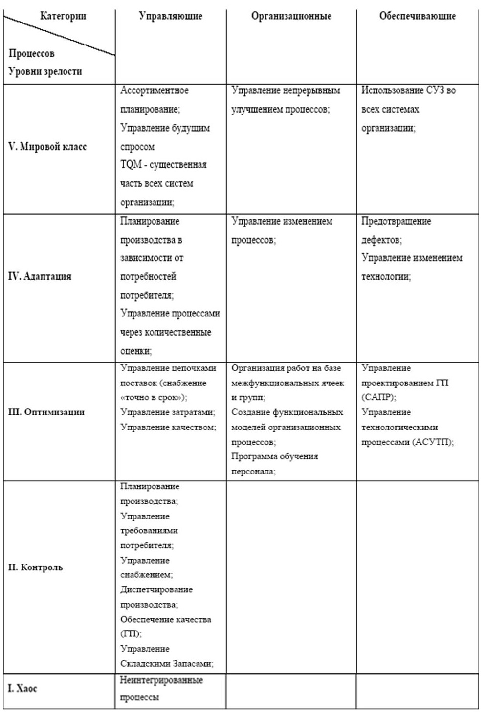 Процессы оптимизированы (соответствует уровням BPI «Контроль» и «Оптимизация»), характеризуется тем, что полностью формализованы процессы как в управлении, так и в производстве; процессы документированы, стандартизованы и объединены в единый информационный поток; существует возможность оперативного получения информации о качестве использования ресурсов и проведения анализа по основным аспектам управленческой деятельности, то есть проведено нормирование процессов, на основании которого достигается оптимизация планирования; постановка долгосрочных целей базируется в основном на показателях предшествующего периода (преобладает аналитический аспект);