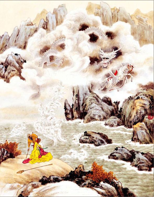 Идя впереди и держа наперевес посох, прекрасный Царь обезьян прокладывал в горах путь. Вскоре они поднялись на вершину. Тут перед ними раскрылись необозримые пространства: