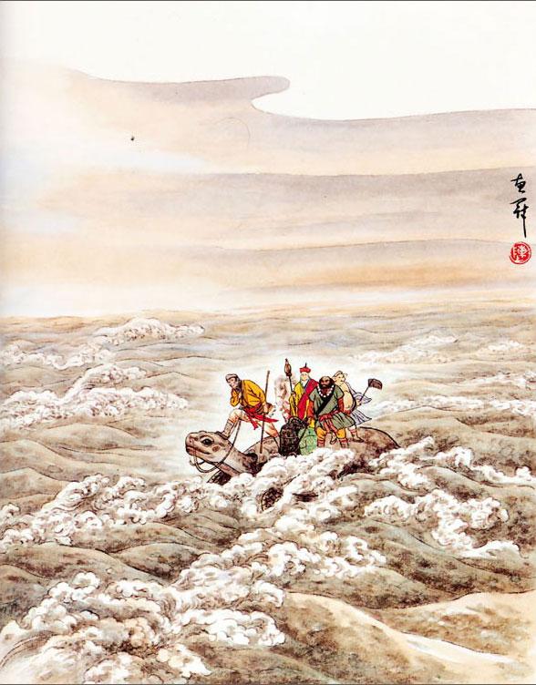 Итак, налетел ураган, а когда он утих, монахи не увидели ни Сюань-цзана, ни его учеников. Таким образом наши спутники избавились от провожающих. Монахи больше не сомневались, что путники, посетившие их монастырь, были живые Будды, сошедшие на землю, а потому низко поклонились им вслед и повернули обратно. Тут мы и распрощаемся с ними.