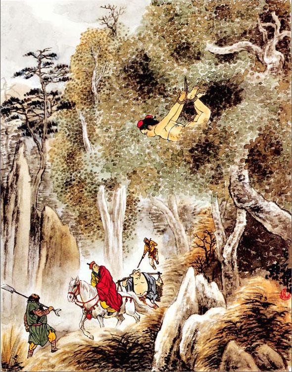 О мой отец, о мой наставник дорогой!Изгладится ль из памяти то время,Когда горы большой с меня свалили бремя,И, к вере приобщась, пошел я за тобой?В пути на Запад отдыха не знал…Меня не изумляли, не страшилиНи злобных демонов разнузданные силы,Ни горных рек разлив, ни моря грозный вал,А здесь на ровном месте оступился,В открытую канаву провалился…С тобой, наставник мой, и я в беду попал!Предаваясь безутешной скорби, прекрасный Царь обезьян, Сунь У-кун, вдруг услышал, что за склоном горы кто-то горько плачет. Он быстро выпрямился, утер слезы и, оглянувшись, стал всматриваться. Он увидел женщину в глубоком трауре. Всхлипывая, она медленно приближалась к нему. В левой руке она несла плошку с жидкой пищей, а в правой держала жертвенные бумажные деньги, которые по обычаю сжигают на могиле.