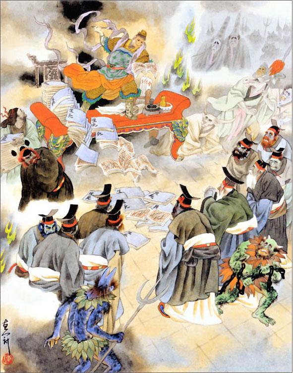 – Все это неважно, – отвечал им Сунь У-кун. – Но когда я спал, сюда пришли два человека, которые увели меня в царство мрака. Тут только я проснулся и произнес свое волшебное заклинание. Меня проводили прямо во дворец Владыки Преисподней, где восседали судьи смерти. Их было десять. Я поссорился с ними, с этими судьями, просмотрел книгу жизни и смерти и там нашел наши имена. Я вычеркнул их, и теперь мы не будем больше подчиняться Владыке Преисподней.