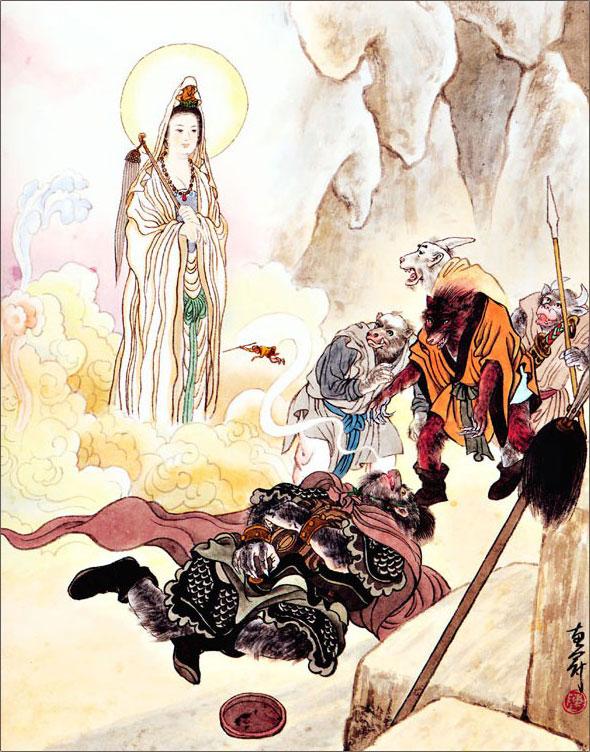 Закачал, как шелковинки,Ветер ветви тонких ив,Этот край неизъяснимоЖивописен и красив.Здесь тепло цветы раскрыло,Чтоб повеял аромат,И во двор, к цветенью яблонь,Снова ласточки летят.Это время заставляетСнова птиц счастливых петь.Хорошо на мир цветущийС любованием глядеть!Всюду светлые дорогиВ красном мире пролегли,Блещут пышные одежды,Льется музыка вдали…Дуют в дудочки травинок,Ночь не кажется длинна,Проходящая в беседеЗа кувшинами вина.И вот однажды, когда Трипитака и его ученики наслаждались окружающей природой, путь им снова преградила гора. – Ученики мои, – молвил Трипитака, – будьте осторожны. Боюсь, что на этой горе живут оборотни. Как бы они не причинили нам вреда.