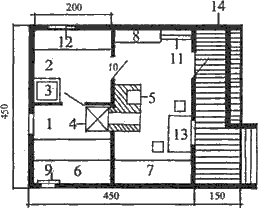 Рис. 6. План бани: 1 – парная; 2 – моечная; 3 – душевой поддон; 3 – предбанник; 4 – печь-каменка; 5 – камин; 6 – полок; 7 – лежанка; 8 – подставка; 9 – отдушина; 10 – двери;11 – вешалка; 12 – окно; 13 – стол; 14 – терраса.