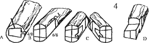 Рис. 16. Вычерчивание шаблона «лапы»: 1 – квадрат, вычерченный по среднему радиусу бревна; 2 – вычерчивание шаблонов; 3 – готовые шаблоны; 4 – расчерчивание «лапы» на бревне: А – торец, В – закрытая боковая «лапа», С – боковины, D – готовая «лапа».