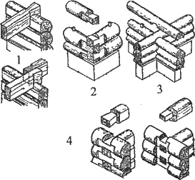 Рис. 18. Угловые соединения бревен: 1 —соединение бревна с балкой перекрытия; 2 – в «лапу», 3 – в «чашу»; 4 – соединение внутренней стены с наружной.