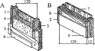 Рис. 20. Стены: А – каркасные; В – панельные; 1 – стойка; 2 – обвязка; 3 – брусок; 4 – минераловатные плиты или другой утеплитель; 5 – пергамин; 6 – доска; 7 – отделочная доска.