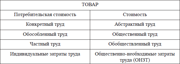 Противоречия товараТовар нельзя разделить на стоимость и потребительную стоимость. Это два свойства одно и того же явления. Отсюда понятно, что потребительная стоимость и стоимость находятся в системе диалектических противоречий. Основными формами проявления противоречий являются следующие. Во-первых, это противоречия труда, в результате которого создаётся товар, т. е. противоречия между конкретным и абстрактным трудом, частным и общественным трудом, между обособленным и обобществлённым трудом, между индивидуальными затратами труда и ОНЗТ. Противоречия обнаруживаются, начиная с производства товара и заканчивая его потреблением в новом цикле производства или в сфере личного потребления. Эти противоречия не следует понимать только с отрицательными последствиями. В реальной экономике они выступают источником её совершенствования и развития. Для того чтобы конкретный, индивидуальный и обособленный труд стал частицей обобществлённого труда и принял общественную форму, т. е. признан обществом, произведённый продукт должен удовлетворять потребности членов социума. Без этого труд будет затрачен впустую. Эти обстоятельства вынуждают товаропроизводителя совершенствовать своё производство.