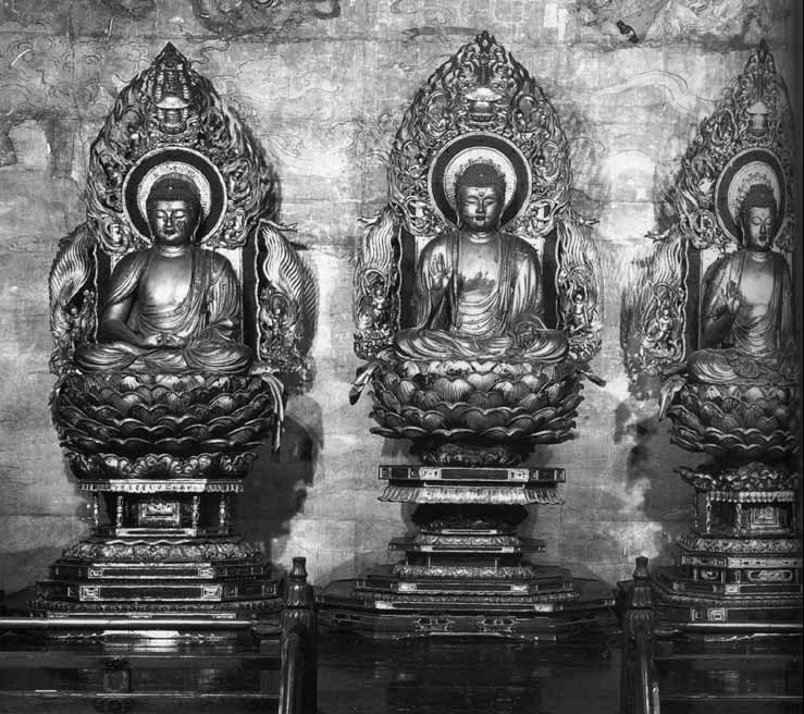 Особое место в японской пластике отводилось изображению будд нёрай (татхагата) – Так пришедший. Храмовые постройки, в которые помещали скульптуры будд, занимали на территории определенное место в соответствии со сторонами света: храм с буддой грядущего Мироку (пока еще бодхисаттва) Мирокудо располагался на севере, с Амида на западе – Амидадо, с Якуси на востоке – Якусидо и с главным Буддой Шакьямуни на юге – Сякадо. Они концентрировались вокруг водоема. Три будды Амида (Дипанкара), Сяка (Шакьямуни) и Мироку (Майтрейя) воспринимались как будды трех миров сандзэбуцу: соответственно прошлого какобуцу, настоящего гэндзайбуцу и будущего мирайбуцу, олицетворяющие бессмертие буддизма. Например, три фигуры этих будд как символы покоя и счастья находятся в храме – Сэннюдзи г. Киото (эпоха Камакура, важное культурное достояние – дзюё бункадзай). На первый взгляд они равновелики и идентичны. Но Будда Шакьямуни восседает на пьедестале, который несколько отличается по конфигурации и высоте, разнятся и мудры. Левая рука Мироку спокойно лежит на колене ладонью вниз (у Шакьямуни ладонью вверх), олицетворяя изгнание демонов, – мудра комаин. В тот момент, когда Мироку достигнет просветления, силы зла исчезнут.