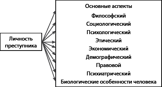 Необходимо учитывать, что даже в такой специфической сфере, как преступление, человек действует в качестве общественного существа. Поэтому к нему надо подходить как к носителю различных форм общественной психологии, приобретенных нравственных, правовых, этических и иных взглядов и ценностей, индивидуально-психологических особенностей. Все это в целом представляет собой источник преступного поведения, его субъективную причину, предопределяет необходимость изучения всей совокупности социологических, психологических, правовых, медицинских (в первую очередь психиатрических) и других аспектов личности преступника.