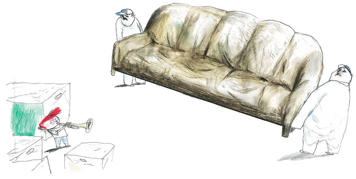 Булле промчался между ног у грузчиков, переносивших мебель, и вошел в новый дом. И тут на картонной коробке в коридоре увидел свою трубу. Вздохнув с облегчением, он схватил ее. Булле, его сестра и мама приехали на первом фургоне накануне вечером, и он переживал, захватят ли коробку с его трубой.