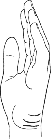 Цель идеалистов – слава, цель практических людей – богатство. Следовательно, чтобы узнать, какие наклонности господствуют у человека, надо сравнить, который из двух пальцев – указательный или безымянный – длиннее. Это сравнение легко сделать, принимая средний палец за масштаб (рис. 21 и 22).