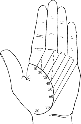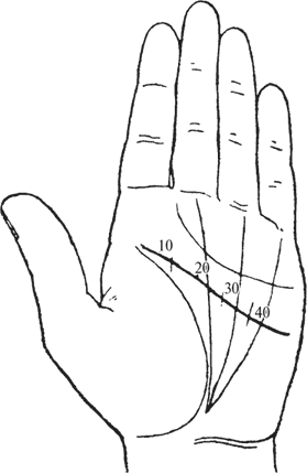 Из пересечений линии сердца с другими линиями следует определение времени великих душевных волнений и сердечного горя, которое обозначается перерывами вдоль линии, течением подобным цепи или тем, что эта линия сопровождается малыми зубцами. Определение моментов времени происходит так же, как и при линии головы, и здесь точки пересечения с линией судьбы, с линией Солнца и линией Меркурия означают определенные возрасты. Мы ссылаемся на рис. 18 и замечаем, что пересечение с линией Меркурия означает 10-й год жизни, пересечение с линией Аполлона – 20-й и пересечение с линией Сатурна – 40-й год жизни.