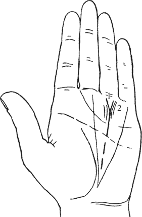 Хорошо прорисованная линия Солнца дает указания на изобретательную способность. Если эта линия при своем начале ниже пальца Аполлона сопровождается несколькими маленькими линиями, то данный субъект имеет высокоразвитые артистические способности (рис. 19, 2).