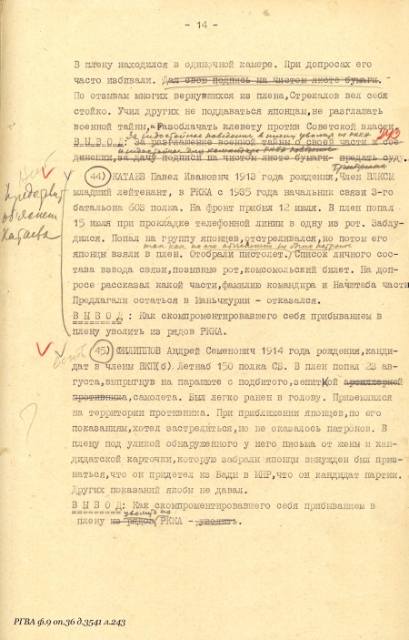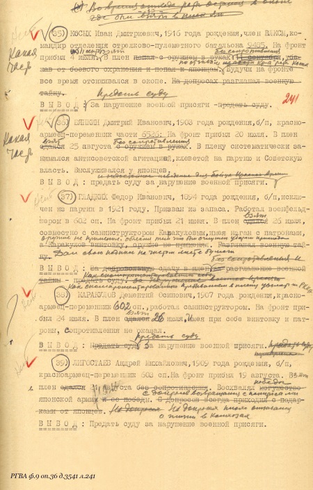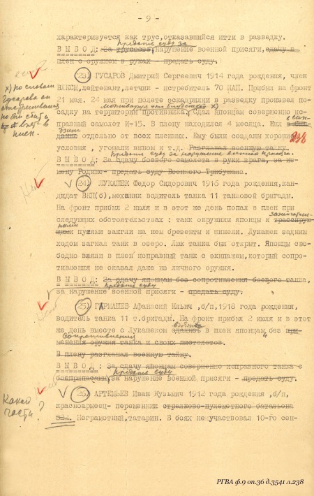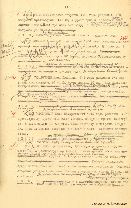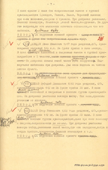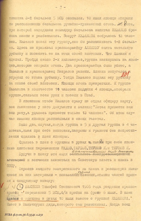 «…6-го июля в бою с японскими самураями ранило нашего командира старшину тов. Баранова, он стал звать о помощи, я бросился к нему на помощь, но не добегая до него, мне путь отрезали самурайские танки, я залег в окопе, крикнув командиру, чтобы он перестал кричать и стал бросать гранаты в танки, бросил 2 гранаты, затем, смотрю, бегут прямо на меня 2 самурая, я открыл по ним огонь, один самурай упал, второй бросился обратно за ту сопку. В это же время с другой стороны услышал самурайский крик, я обернулся в ту сторону и увидел шагах в 16 или 20 от меня стоял самурай, размахивая шашкой и бросился ко мне, я выскочил из окопа встретить его штыком, но тут с правой стороны мелькнула возле меня самурайская фигура, который вдарил мне по голове прикладом, но приклад не попал в середину головы, а пошел вперед, и у меня от этого удара каска съехала с головы на лоб, но удар отразился на моей винтовке, винтовку выбило из моих рук, я от этого удара упал на колени, подняв голову увидел в щель, что возле меня прыгает самурай, хочет меня заколоть, я ухватил его правой рукой за штык, а левой за ствол и пригнул к земле. В это время подбежал самурай с шашкой и ударил меня ногой в левый бок, я упал. Тут насели на меня самураи, стали бить, стягивать снаряжение, я здесь еще раз крикнул последний раз: «командир, спасайся», и когда я уже был связан и лежа на земле в лапах самураев, я услышал в стороне, где лежал командир, взрыв, после взрыва я уже не слышал его голоса, просящего о помощи, здесь уже начались издевательства самураев надо мною, кто бил ногой, кто кулаком, кто топтал связанные руки и потом уже подошел ко мне самурайский офицер и обнажив наполовину шашку, стал водить по горлу, я плюнул на него и отвернулся, за это он меня ударил шашкой по голове, отчего я на время потерял сознание, когда я открыл глаза, меня опять подняли и хотели застрелить, но почему-то отставили и потащили за сопку, там били, затем посадили на танк сзади башни и отправили дальше. Когда подвели к офицеру, он ткнул шашкой и ударил в грудь кулаком, я упал на спину, мне завязали глаза и связали ноги…». Свидетелей, могущих подтвердить обстоятельства пленения, не было.