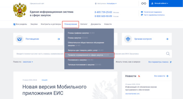 Одна из обязанностей всех заказчиков при планировании своей закупочной деятельности – это проверка соблюдения правил нормирования в сфере закупок, которые на данного заказчика распространяются. Получить актуальную информацию о действующих в отношении себя правилах заказчик вправе напрямую от своего учредителя – главного распределителя бюджетных средств, в ведении которого находится заказчик. Либо необходимая информация доступна в ЕИС, в меню «Планирование» на главной странице портала, а затем на вкладке «Правила нормирования в сфере закупок».