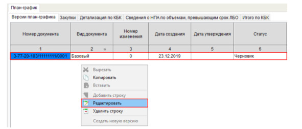 Теперь необходимо добавить позиции на сайт закупки через «Электронный бюджет». Кликните по рабочей версии правой кнопкой мыши и выберите «Редактировать».