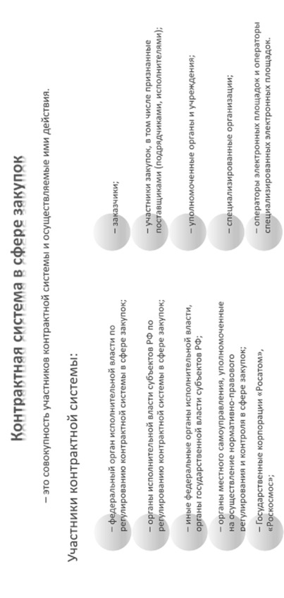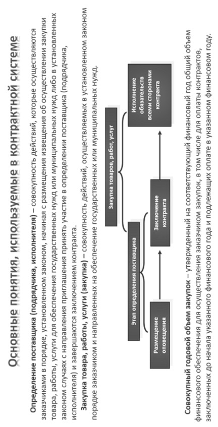 Контрактная система в сфере закупок товаров, работ, услуг для обеспечения государственных и муниципальных нужд – 1) совокупность участников контрактной системы в сфере закупок и осуществляемых ими, в том числе с использованием единой информационной системы в сфере закупок (за исключением случаев, если использование такой единой информационной системы не предусмотрено законом), в соответствии с законодательством РФ и иными нормативны-ми правовыми актами о контрактной системе в сфере закупок действий, направленных на обеспечение государственных и муниципальных нужд; 2) совокупность участников контрактной системы и осуществляемые ими действия.