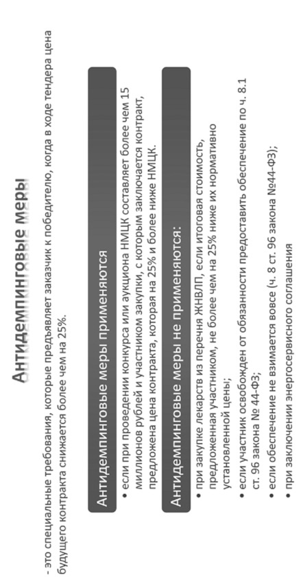 Антидемпинговые меры – специальные требования, которые предъявляет заказчик к победителю, когда в ходе тендера цена будущего контракта снижается более чем на 25%.