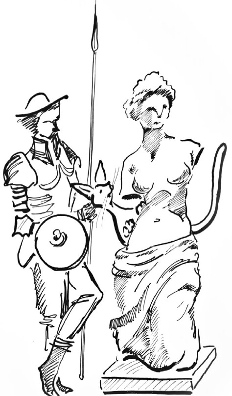 За Моисеем в полки просочились несколько амфор, Будда, Конфуций, красавица-эфиопка с кувшином на плече, непонятный козлобородый мужик, театральный бинокль, верблюды и слоны из всех пород дерева, разудалый боцман, три шкатулки с неизвестным содержимым и – уж совсем неизвестно почему – Дон Кихот.