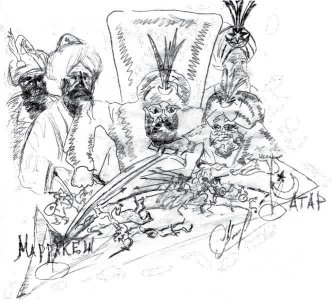 – О, великий повелитель правоверных! – продолжал свою речь военачальник Йахья-Ибн-Омар. – Милостью Аллаха всемогущего и милосердного, мы не сможем сразу пойти на великий магрибский город Сиджильмаса[7], не усилив нашу армию пешими и конными воинами наших союзников. Из Аудагоста армия великого халифа выдвинется в город Тимбукту. Когда мы достигнем Тимбукту, правитель города Мусса-Ибн-Халид милостиво предоставит нам десять тысяч пеших и пять тысяч конных мессуфа[8] для похода на отступников веры. Пополнив запасы воды и продовольствия в Тимбукту, мы выдвинемся в город Атар, и уже из Атара, мы обрушим наши клинки на головы неверных Магриба, – посвятил он в подробности плана великого правителя.