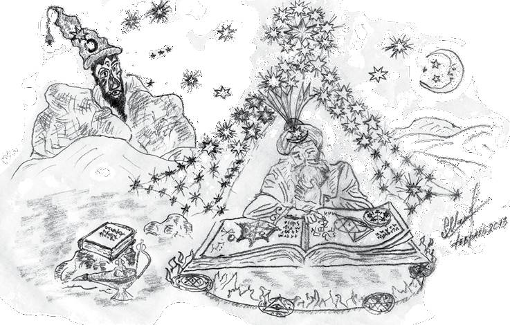 Взобравшись на бархан, Аль-Мажнун оцепенел от увиденного: огненный круг в свете луны и звёзд, похожий на небесный шатёр, весь светился от пиктограмм и магических знаков. В центре круга сидел Аль-Фарух, а перед ним словно повисла в воздухе открытая книга с горящими буквами невиданного ранее языка. Страницы книги перелистывались сами собой, при этом Аль-Фарух что-то записывал, не переставая повторять какие-то заклинания.