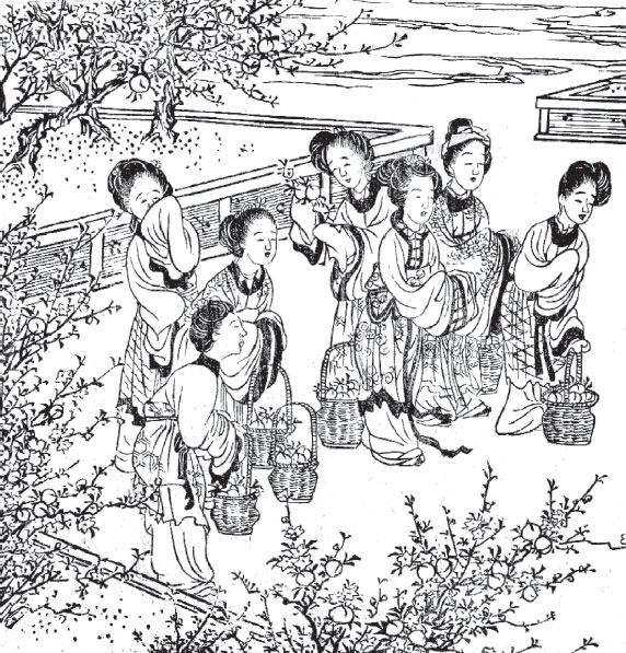 Прочитав надписи, Сунь Укун с усмешкой подумал: «С такими-то „ничтожными слугами“ во дворце как императору не стать легким мыслями?» Вдруг в зал вошла служанка с зеленой бамбуковой метлой и заговорила сама с собой: «Ха-ха! Император спит, и его советники тоже. Нынче Зал Зеленой Яшмы превратился в „Павильон Спящих Небожителей“! Прошлую ночь наш Легкий Мыслями Сын Неба провел со своей любимой дамой Погибель Царству[11]. Они пировали в заднем парке Дворца Зимородков, пили и веселились до самого рассвета. Сначала наш государь велел принести зеркало „Горы Высокие Тан“[12] и приказал Погибели Царству встать с левой стороны, а госпоже Сюй – с правой, сам встал посередине, и они принялись втроем смотреться в зеркало. Сын Неба сказал дамам: „Вы прекрасны!“ – а те ему в ответ: „Вы, Ваше величество, само совершенство!“ Сын Неба повернулся и спросил нас, дворцовых наложниц, хорош ли он. И все наложницы, числом в три или четыре сотни, воскликнули в один голос: „Воистину муж необыкновенной красоты!“ Сын Неба очень обрадовался и с взором, затуманившимся от удовольствия, осушил большую чару вина. Захмелев наполовину, он встал поглядеть на луну и расхохотался. Показывая на лунную фею Чанъэ[13], он сказал: „Вот моя госпожа Сюй“. А госпожа Сюй показала пальцем на небесную Ткачиху и Пастуха[14] и сказала: „А вот это вы, Ваше величество, и Погибель Царству. Хотя сегодня пятый день третьей луны, давайте отметим праздник Седьмой Ночи“. Сыну Неба эта затея пришлась по душе, и он снова опрокинул полную чару вина. Тут государь вконец захмелел и уже не мог бы сказать, сколько будет трижды семь или дважды восемь. Лицо у него стало красным, как кровь, голова то и дело падала на грудь, язык заплетался, ноги подгибались, и он повалился на госпожу Сюй, а Погибель Царству села рядом и возложила государевы стопы себе на колени. Была там еще девица из служанок госпожи Сюй, очень привлекательная собой и к тому же сметливая. Сорвав хризантему, она подбежала и, хихикая, воткнула цветок в волосы Сына Неба, чтобы он стал похож на Сына Неба, Опьяненного Цветами. Такое веселье! Ни дать ни взять – остров блаженных на земле!
