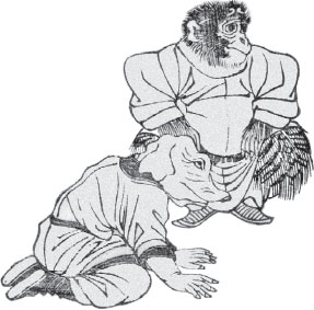 Услышав эти слова, Танский монах стегнул свою лошадь и поскакал вперед. Вдруг из толпы девушек выбежали дети и окружили лошадь Танского монаха. С любопытством оглядев необычного всадника, они пустились в пляс, выкрикивая: «Глядите-ка, он уже совсем взрослый, а одет как нищий мальчишка!»