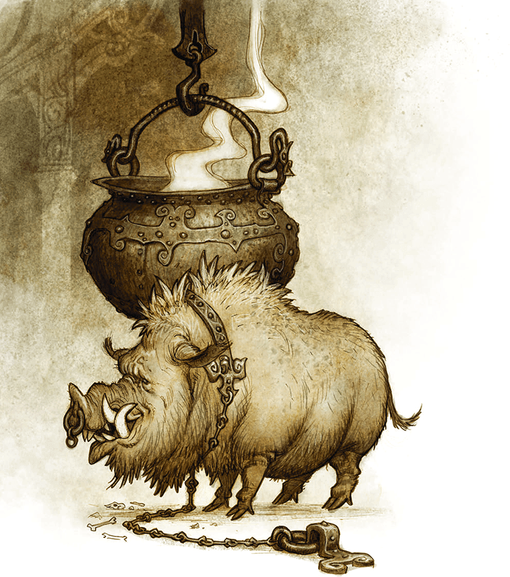 Сколько бы ни было эйнхериев, им всегда хватает мяса вепря Сэхримнира. Каждое утро вепря варят, а вечером он воскресает, цел и невредим, так что на следующий день его вновь можно есть. Мёд, который они пьют (а эти могучие воины не признают никакого питья, кроме мёда), дает коза Хейдрун, пасущаяся на крыше Вальгаллы. Из ее сосцов вытекает так много мёда, что каждый день наполняется огромная чаша. Однако сам Один, восседающий на престоле, ничего не ест и пьет только вино.