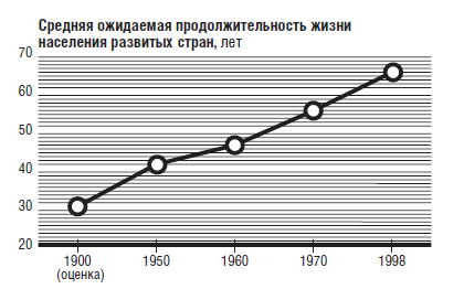 Сегодня в развивающихся странах люди в среднем живут на 15 лет дольше, чем жили столетие назад граждане наиболее развитой в экономическом отношении державы тогдашнего мира – Британии. Наименьшие темпы развития наблюдаются в Тропической Африке, а в последние годы разразившаяся там эпидемия СПИДа сводит на нет даже то немногое, чего этим странам удалось достичь. С 1960 года средняя ожидаемая продолжительность жизни в регионе увеличилась всего на пять лет (с 41 до 46). Наибольшая средняя ожидаемая продолжительность жизни по-прежнему наблюдается в самых богатых странах – в государствах – членах Организации экономического сотрудничества и развития (ОЭСР) этот показатель составляет 78 лет. Однако по темпам роста лидируют именно бедные страны. В 1960 году средняя ожидаемая продолжительность жизни в развивающихся странах была на 40 % меньше аналогичной цифры для развитых государств. Сейчас разница составляет лишь 20 %. Сегодня 90 % жителей планеты могут надеяться на то, что проживут больше 60 лет, – то есть в два с лишним раза дольше, чем их предки сто лет назад.