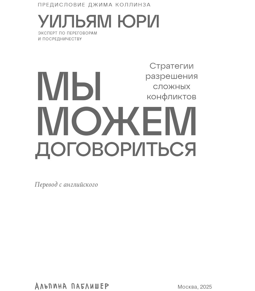 В-третьих, Билл Юри относится к редкой категории признанных авторитетов, которые прошли путь от прозорливости интеллектуала до мудрости философа. В этой книге Билл полностью раскрылся как провидец. Мир всегда будет склоняться к войне и насилию; история не подтверждает идею о том, что неизбежное направление развития человеческого общества – это мир и сотрудничество. Билл понимает, что склонность к конфликтам скрыта глубоко в нашей ДНК. Всю свою преподавательскую, писательскую и практическую работу он ведет исходя из реалистичного понимания человеческого поведения, воли к власти и реальной политики. Однако в то же время он остается практичным идеалистом, убежденным, что влечение к миру и сотрудничеству тоже является частью нашей человеческой природы и социальных интересов. Его посыл прост и неотвратим: стремление к мирному разрешению даже самых сложных конфликтов является признаком силы и мудрости, а не слабости. И, что важнее всего, Билл Юри убедительно доказывает: уладить дело миром всегда возможно.