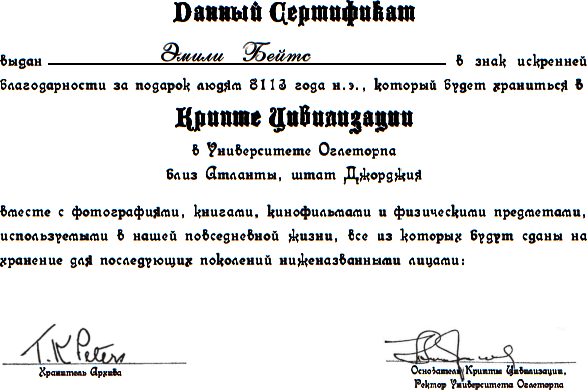 Вы, несомненно, знаете о том, что практически каждая газета и каждый журнал в Америке, а также радиостанции уже передавали и продолжают рассказывать об этом выдающемся проекте. Самые достоверные примеры времени, в котором мы живем, и, в особенности, новые химические продукты, которые поразительным образом отражают нашу настоящую цивилизацию, вместе с микрофильмированными книгами, масштабированными моделями и другими объектами собираются для сдачи на хранение в крипту, которая будет запечатана на шесть тысяч лет. Для нас будет удовольствием, если Вы передадите нам копию самого последнего издания вышеназванной книги. Поскольку необходимо повредить ее для микрофильмирования, то подойдет как свободный, но полный экземпляр с поврежденной обложкой, так и новая книга. Метод обеспечения сохранности описан в прилагаемом бюллетене.