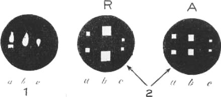 № 2 – Изображения лучей света, проходящих сквозь прямоугольные отверстия в непрозрачной пластине, когда глаз находится в покое (R) и во время аккомодации (А): а, на роговице; b, на передней поверхности хрусталика; с, на задней поверхности хрусталика (согласно Гельмгольцу).