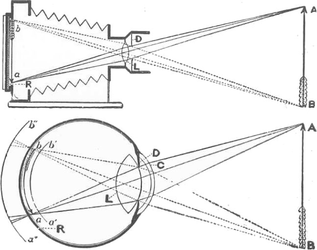 Фотоаппарат: D, диафрагма, сделанная из круговых накладывающихся друг на друга металлических пластин, с помощью которых отверстия, сквозь которые лучи проникают в камеру, могут расширяться или сужаться; L, линза; R, светочувствительная пластина (сетчатка глаза); АВ, объект фотосъемки; ab, изображение на светочувствительной пластине.