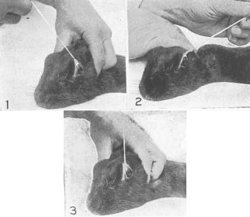 Рис. 15. Демонстрация на примере глаза кролика того, что возникновение аномалий рефракции зависит от деятельности внешних мышц глаза. Шнур привязан к месту крепления верхней косой и прямой мышц глаза