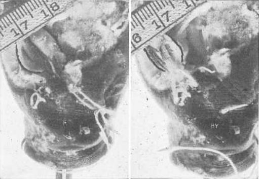 Шнур привязан к основанию верхней прямой мышцы. Сильно потянув за конец шнура, повернули глазное яблоко в глазнице, и, затягивая нить при помощи фиксирующего зажима, захватывающего нижнюю челюсть, его устанавливают в этом положении. Симультативная ретиноскопия зарегистрировала воспроизведение высокой степени смешанного астигматизма. Когда верхняя косая мышца разделена, миопическая составляющая астигматизма исчезает, а когда разрезана нижняя прямая мышца, то гиперметропическая составляющая исчезает и глаз становится нормальным – настроенным на зрение вдаль, – хотя поддерживается натяжение шнура той же силы. Тем доказано, что эти мышцы являются существенными факторами в создании миопии и гиперметропии.