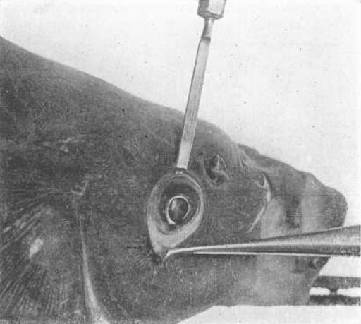 № 1 – Воспроизведение смешанного астигматизма в глазу карпа путем оттягивания нитей, прикрепленных к конъюнктиве, в противоположных направлениях. Заметьте овальную форму передней части глазного яблока.