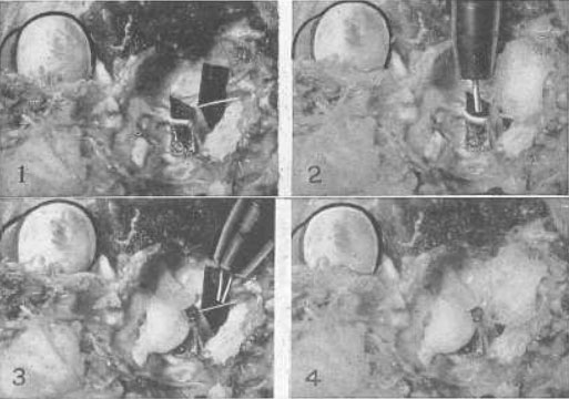 № 1 – Верхняя косая мышца оттянута вверх от глазного яблока при помощи двух нитей, и ретиноскоп показывает отсутствие аномалий рефракции. № 2 – Как определил ретиноскоп, стимуляция электрическим током приводит к возникновению аккомодации. № 3 – Мышца была разрезана. Стимуляцией глазного яблока электрическим током не удалось воспроизвести аккомодацию. № 4 – Разрезанная мышца вновь была соединена путем сшивания. Как и прежде, в результате стимуляции электрическим током возникает аккомодация.