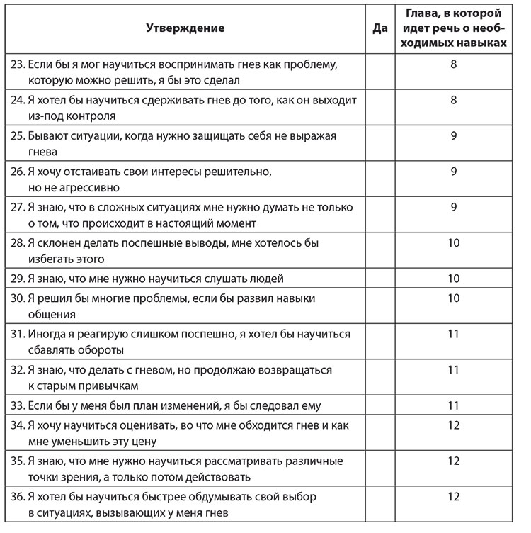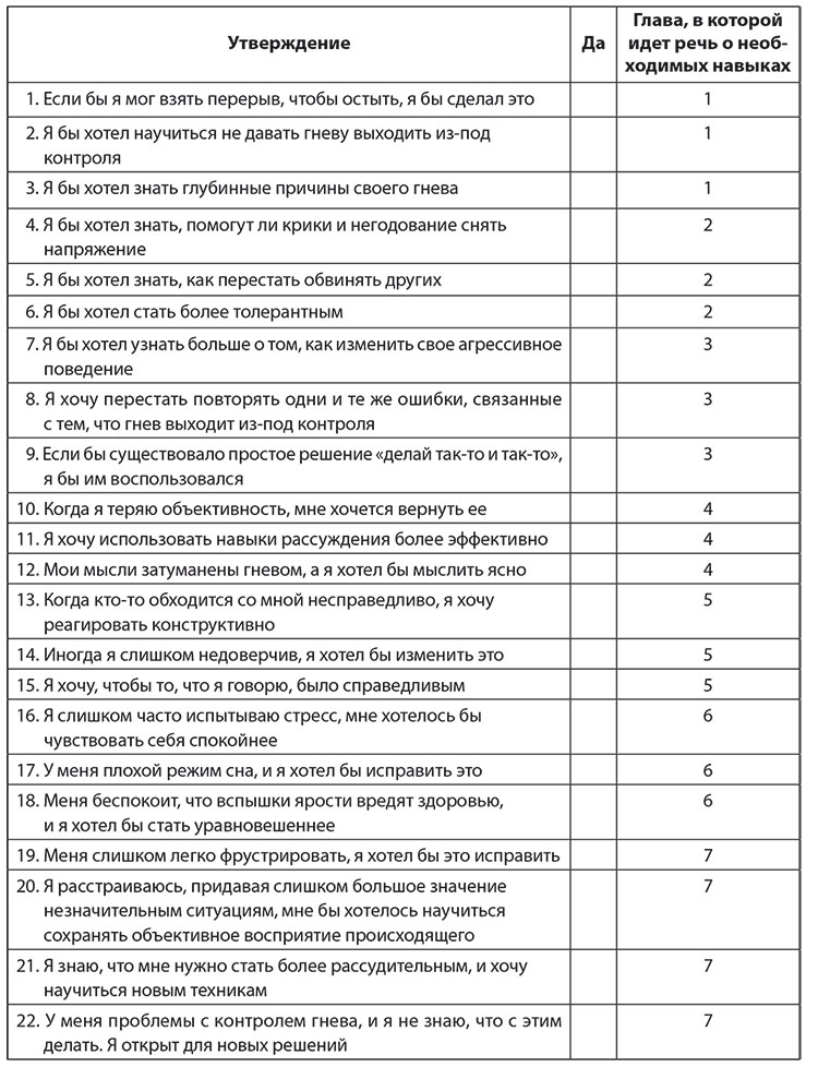 Опросник гневаЭтот опросник не охватывает все возможные характеристики гнева. Но он соотносится с информацией, которую вы найдете в этой книге, и позволит вам определить области, на которых следует сосредоточиться.