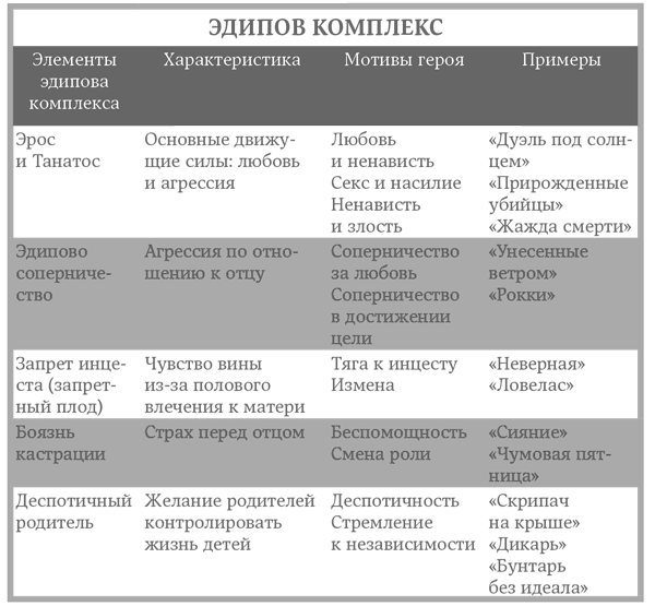 В «Скрипаче на крыше» (Fiddler on the Roof, 1971) Тевье (Тополь) не может принять выбор своей дочери, решившей выйти замуж за иноверца. Он отказывается от дочери и навсегда теряет ее любовь. Конфликт между деспотичным родителем и ребенком может стать основой сюжета и для фильма ужасов. Так, в «Психозе» (Psycho, 1960) деспотичная мать Нормана Бэйтса (Энтони Перкинс) полностью разрушила его личность и продолжает властвовать над ним даже после своей смерти. Работая над сценарием, помните, что связанные с эдиповым комплексом темы соперничества и деспотизма помогут рассказать в фильме о внутреннем конфликте героев, сделать его насыщенным, драматичным. И не обязательно выдумывать новые источники конфликта. Надо просто искать новые способы выражения для этих старых как мир тем.