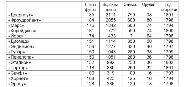 Подробная информация о некоторых наиболее типичных и важных кораблях, пополнивших флот в 1793—1802 годах, приведена в вышеприведенной таблице.