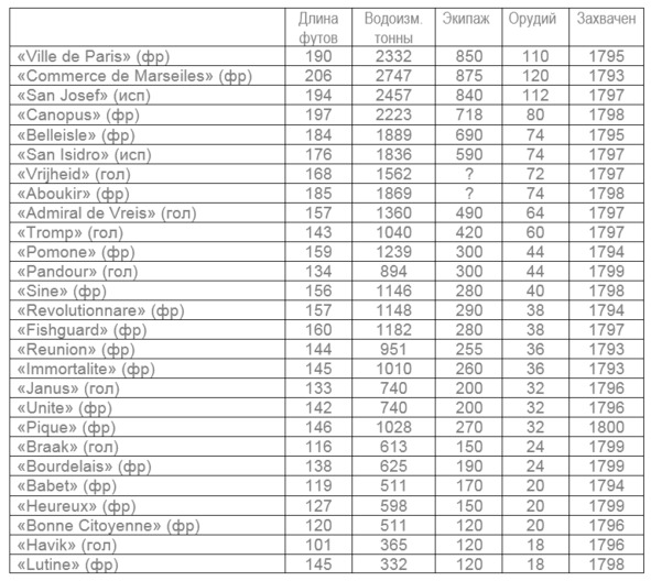 Таблица иностранных кораблей, захваченных и вошедших в британский флот с 1793 по 1800 год