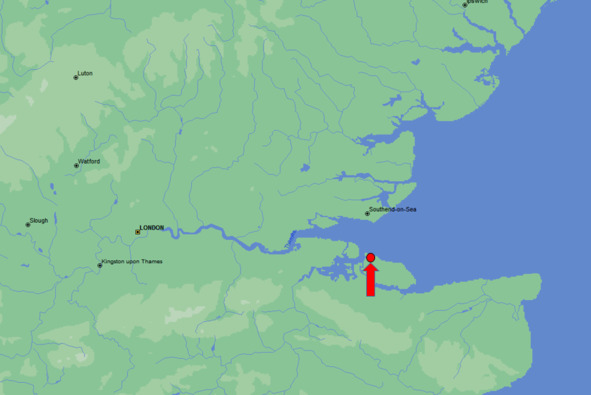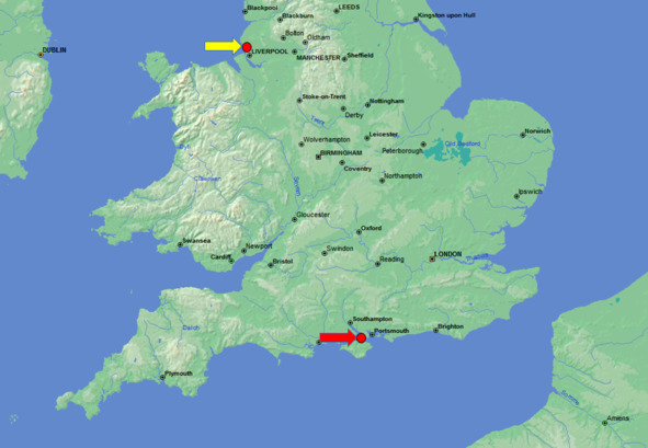 Сент-Хеленс (желтая стрелка), Спитхед (красная стрелка)