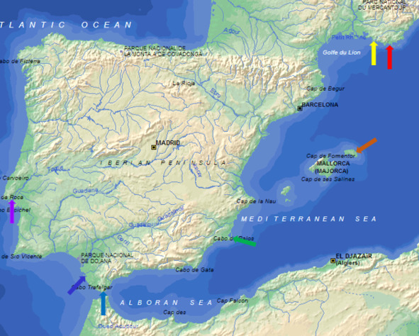 Карта районов Средиземноморья, где происходили события, описанные в Главе I. Тулон (красная стрелка), Марсель (желтая стрелка), Порт-Махон (коричневая стрелка), Картахена (зеленая стрелка), Гибралтар (голубая стрелка), Кадис (синяя стрелка), Лиссабон (фиолетовая стрелка)