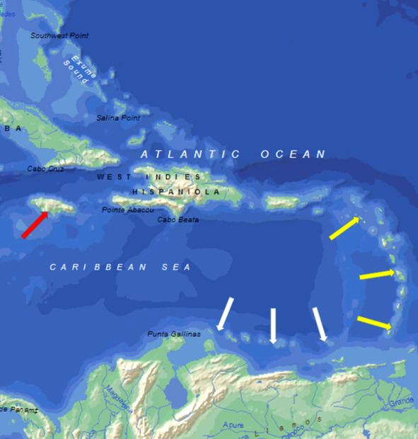 Карибское море. Ямайка (красная стрелка), Подветренные острова (белые стрелки), Наветренные острова (желтые стрелки)