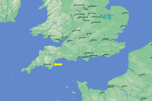 Остров Бель-Иль (желтая стрелка), Брест (черная стрелка), Лорьян (синяя стрелка), залив Киберон (белая стрелка), Рошфор (красная стрелка)