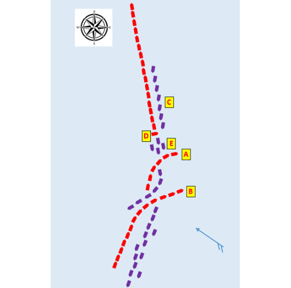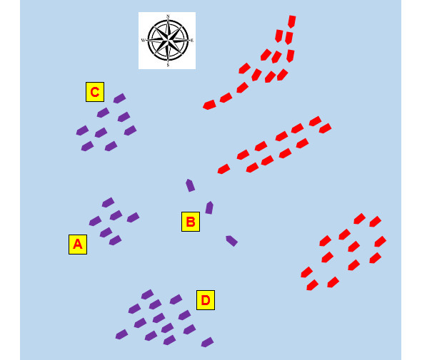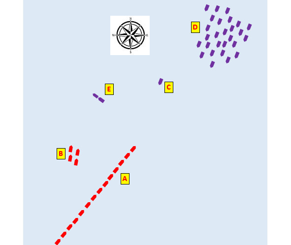 12 апреля 1782 года. А – британский флот; В – четыре корабля, выделенные для захвата «Zele»; С – французский флагман, отставший ночью от основного флота; D – французский флот, спешащий на выручку флагмана; Е – «Zele», буксируемый фрегатом