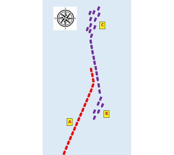 12 апреля 1782 года, 8 ч.00 мин. А – британский флот; В – французский авангард, «проскочивший» за пределами дальности действия британской артиллерии; С – французский арьергард, выстраивающийся в кильватерную линию.