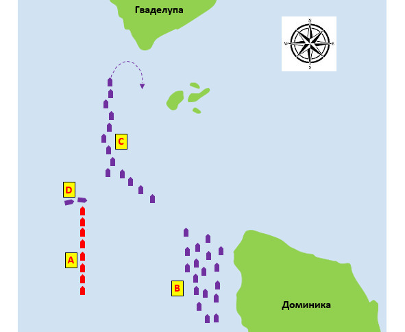 Утро 9 апреля 1782 года. А – авангард Худа, оторвавшийся от основного флота; В – часть французского флота под берегом Доминики; С – французские корабли, пересекающие пролив между островами; D – два французских корабля, пересекающие курс британского авангарда